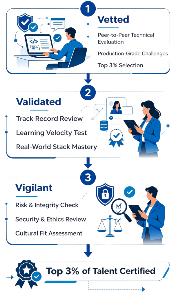 Every candidate passes a peer-to-peer technical deep dive. We don't rely on resumes; we verify their ability to solve complex, production-grade challenges. Only the top 3% of technical applicants pass our internal vetting.